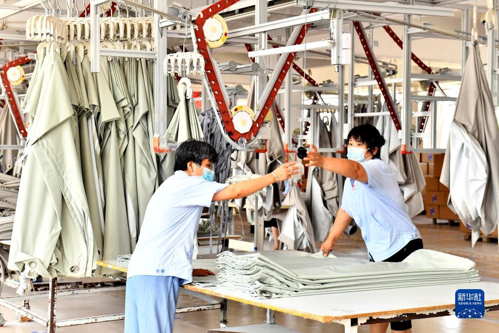 7月21日,在位于威海市文登區的山東銀豐家用紡織品有限公司,工人在加工家紡產品。