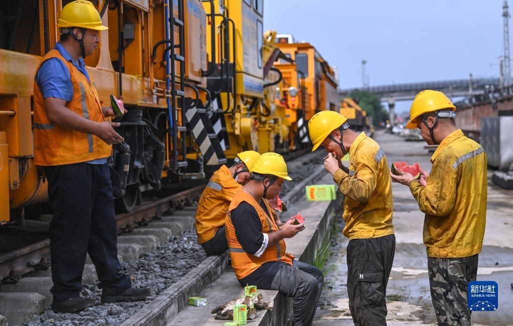 7月21日,國鐵南寧局沿海鐵路公司欽州工務段工人吃西瓜消暑。