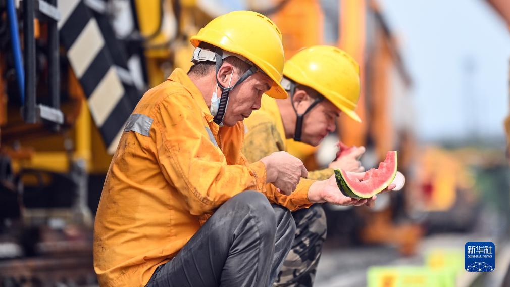 7月21日,國鐵南寧局沿海鐵路公司欽州工務段工人吃西瓜消暑。
