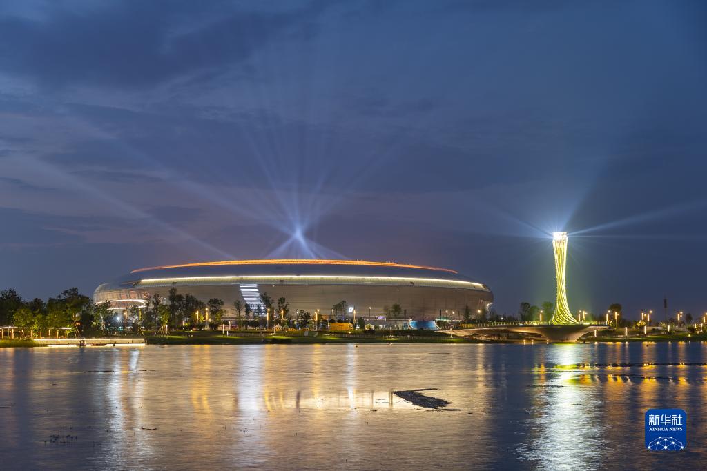 這是在成都市龍泉驛區拍攝的夜幕下的東安湖體育公園(7月18日攝)。