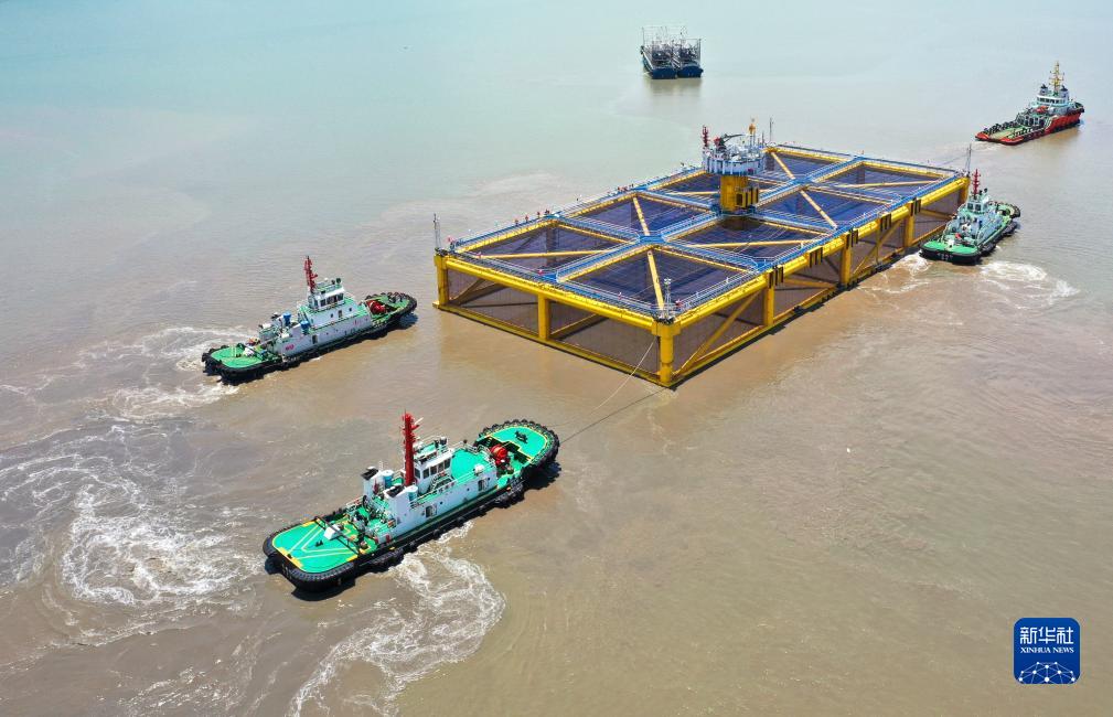 寧德制造的大黃魚深海養殖平臺“寧德1號”拖航出海,駛向霞浦北礵島海域養殖區(無人機照片,6月27日攝)。該平臺裝配自動投喂、氣溫海水監測、信息化自動控制等先進系統,將引領寧德大黃魚養殖由內澳走向深海。