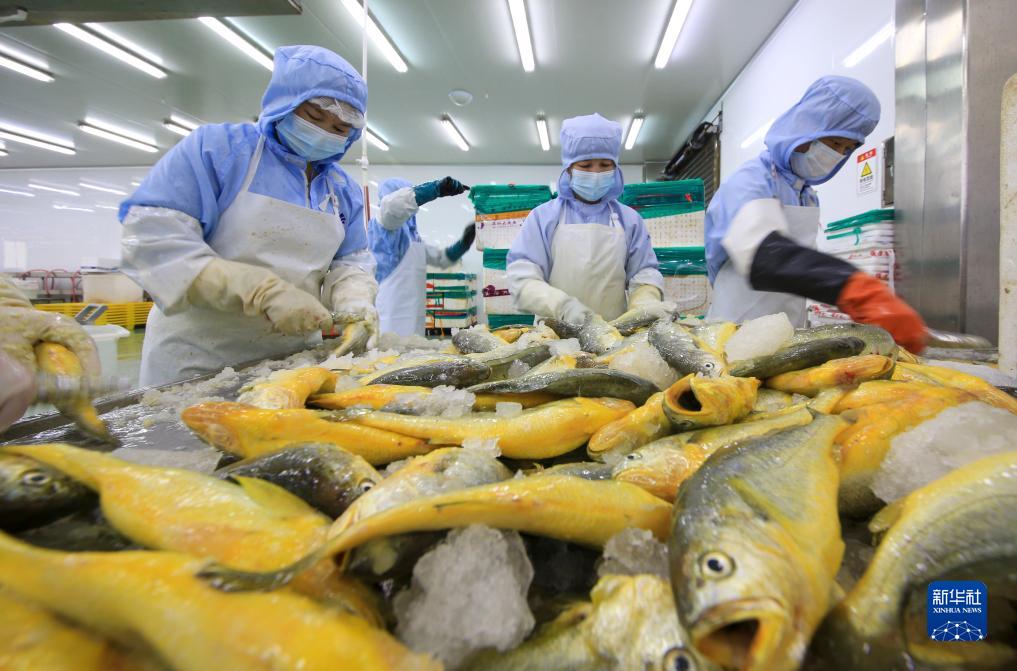 在寧德金盛水產生產車間,工人們加工大黃魚產品。這里每天大黃魚加工量達1.5至2萬尾(5月12日攝)。