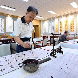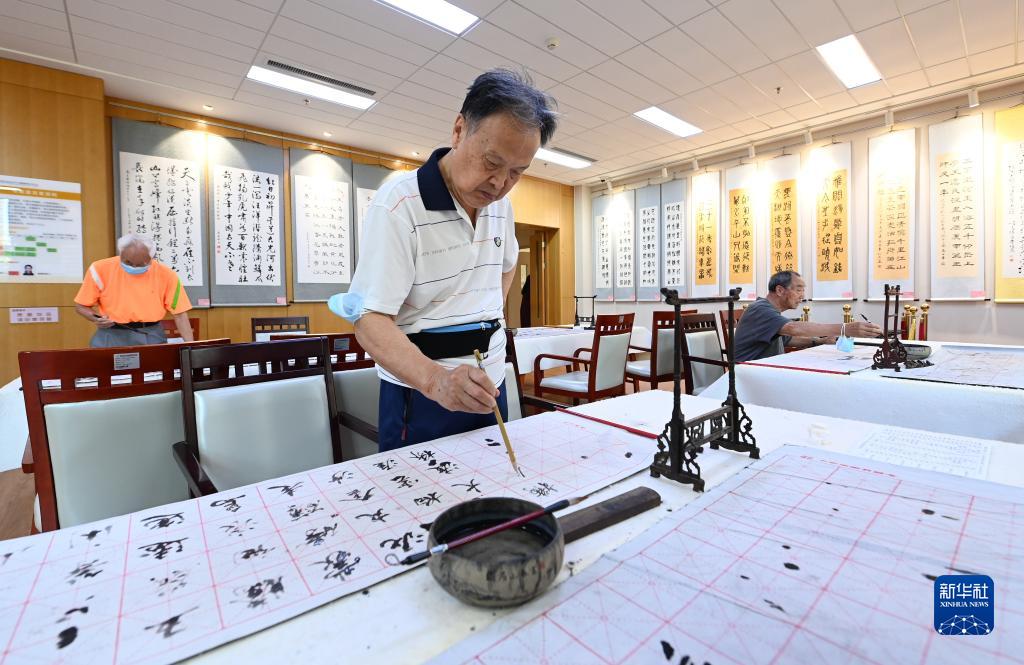河北廊坊三河市燕達金色年華健康養護中心入住老人在活動室練習書法(7月20日攝)。