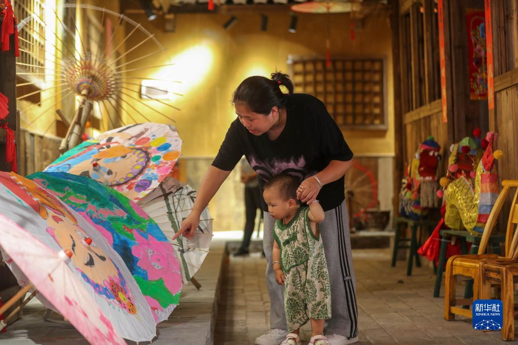 7月21日,市民帶著孩子在貴州省銅仁市印江土家族苗族自治縣非遺文化館了解油紙傘。