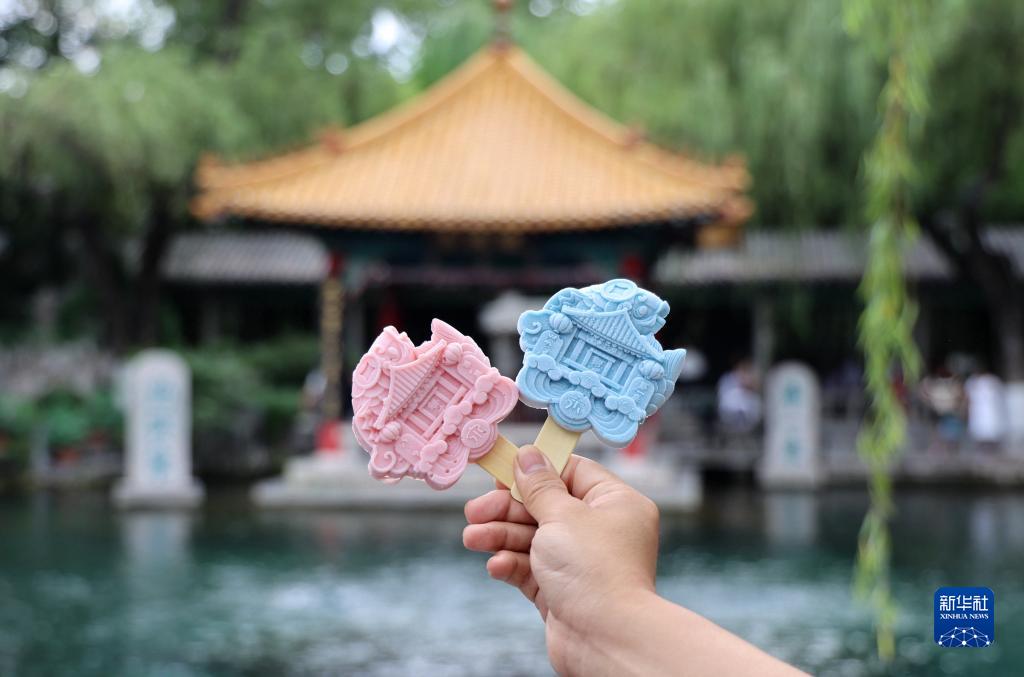 7月16日在山東省濟南市趵突泉景區拍攝的趵突泉造型文創雪糕。