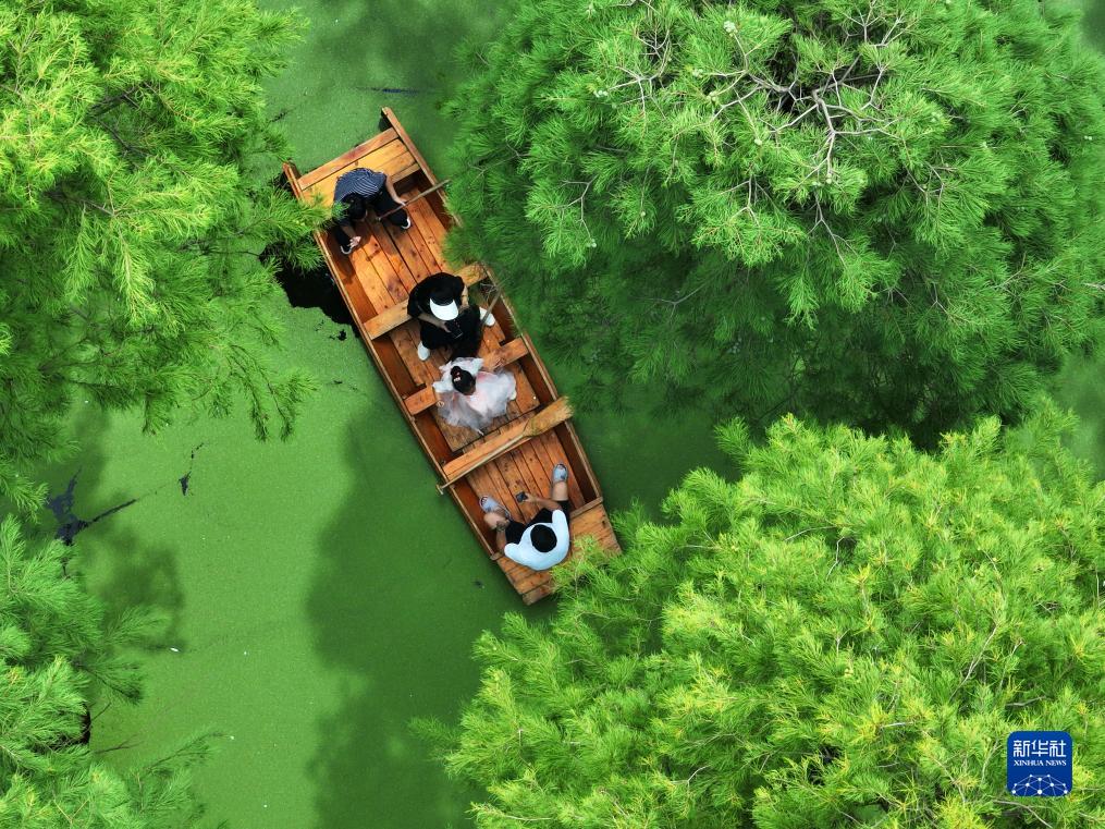 7月21日,游客在江蘇省揚州市江都區淥洋湖濕地公園的水上森林乘船游覽(無人機照片)。