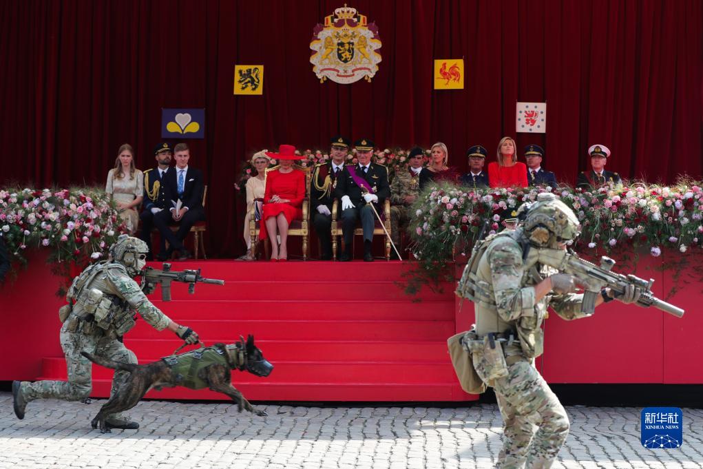7月21日,軍人在比利時布魯塞爾國慶日閱兵式上展示反恐技能。