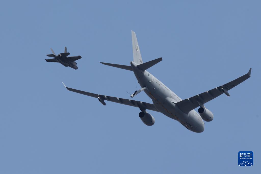 7月21日,在比利時布魯塞爾,一架A330 MRTT加油機(右)與一架F-35A戰機參加國慶日閱兵式。