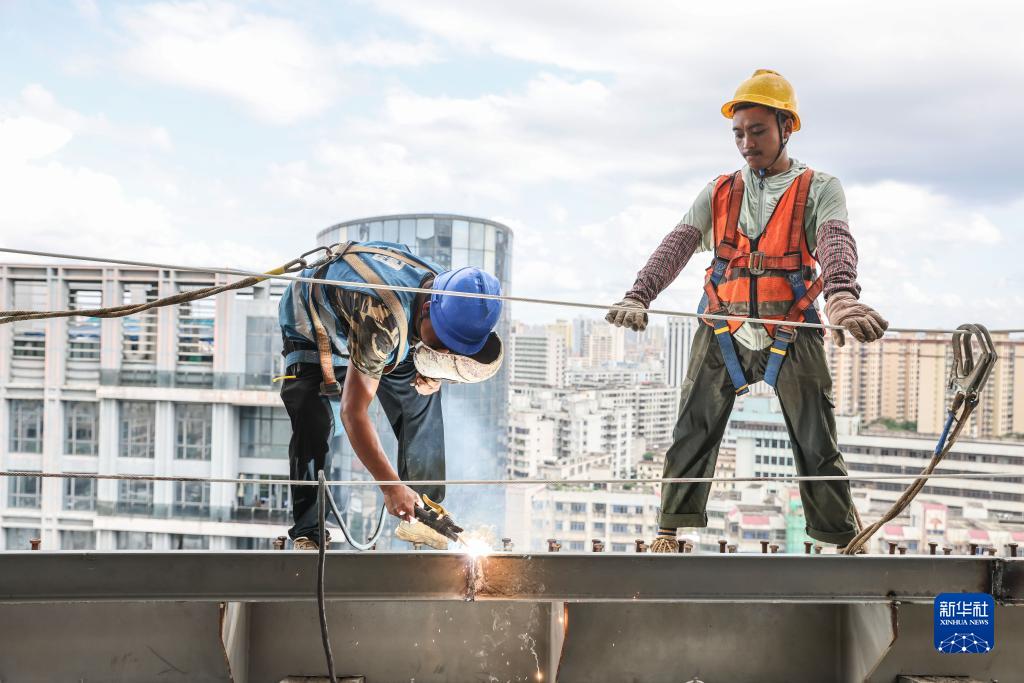 7月21日,工人在??谑泻D现行捻椖康摹翱罩性鞓菣C”內施工作業。