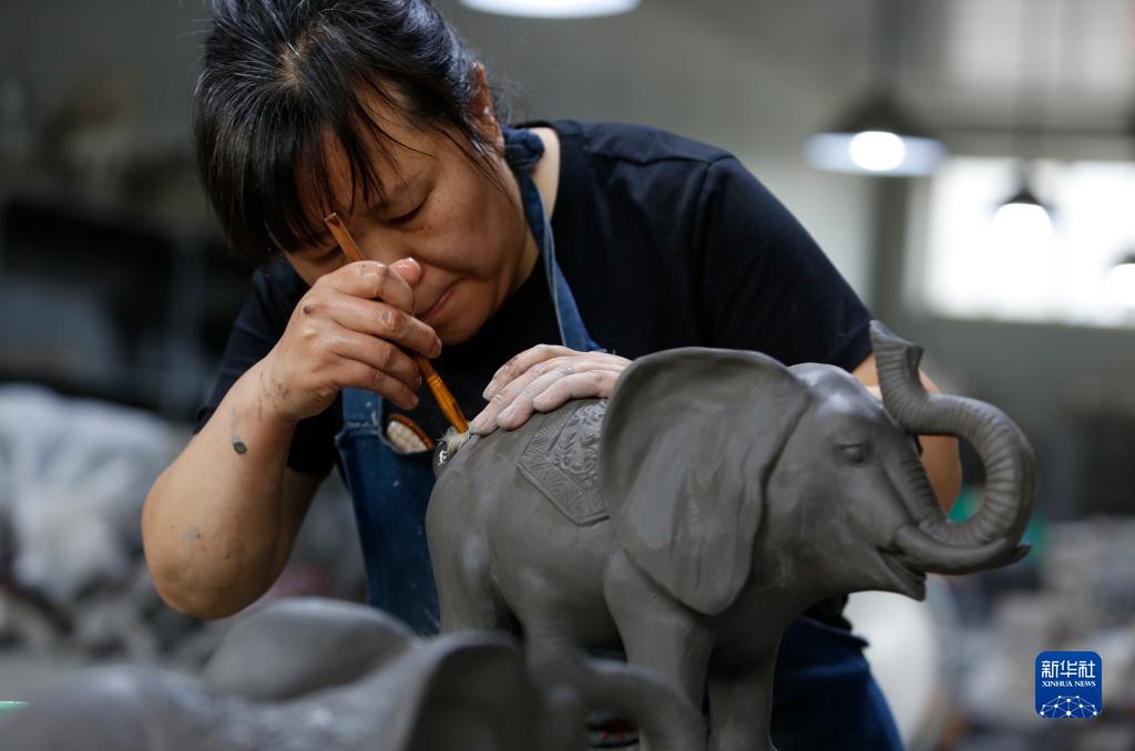 7月19日,在南石山村一家唐三彩生產企業的車間里,工人在加工泥胎。