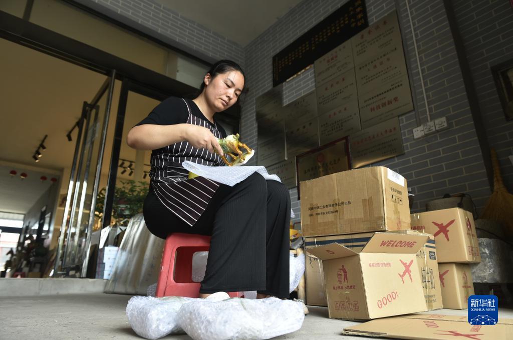 7月20日,南石山村一家唐三彩生產企業的工人在打包唐三彩作品準備外銷。