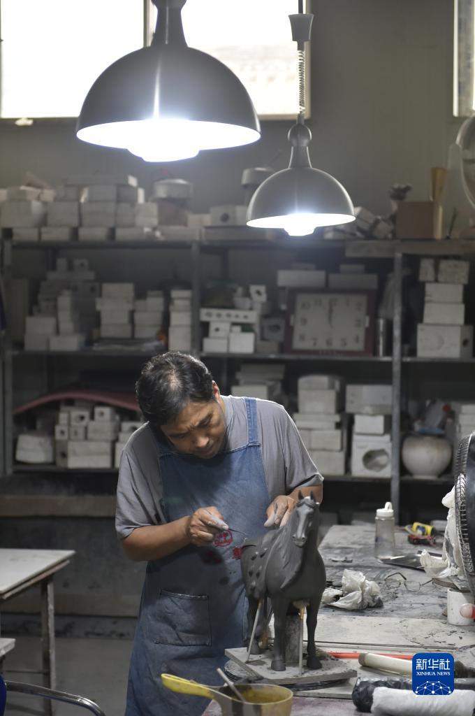 7月19日,在南石山村一家生產企業的車間里,唐三彩藝人高順旺在雕刻泥胎。