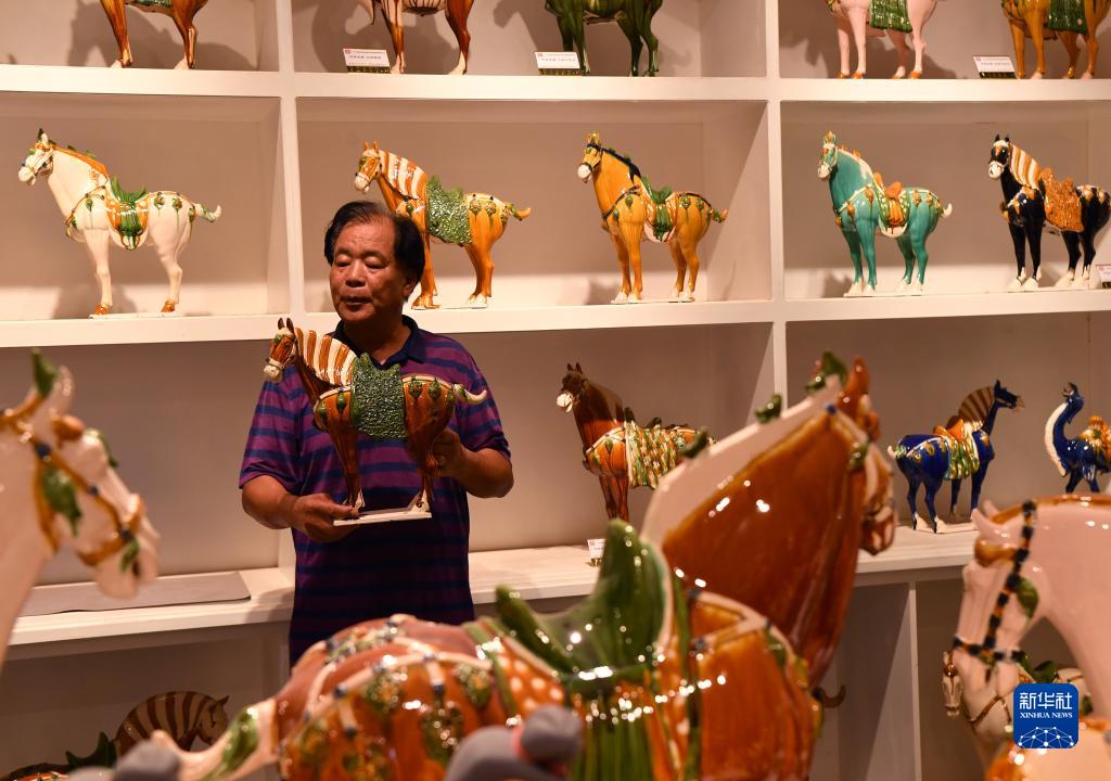 7月20日,在南石山村一家生產企業的展廳里,唐三彩藝人張二孬在查看自家燒制的作品。