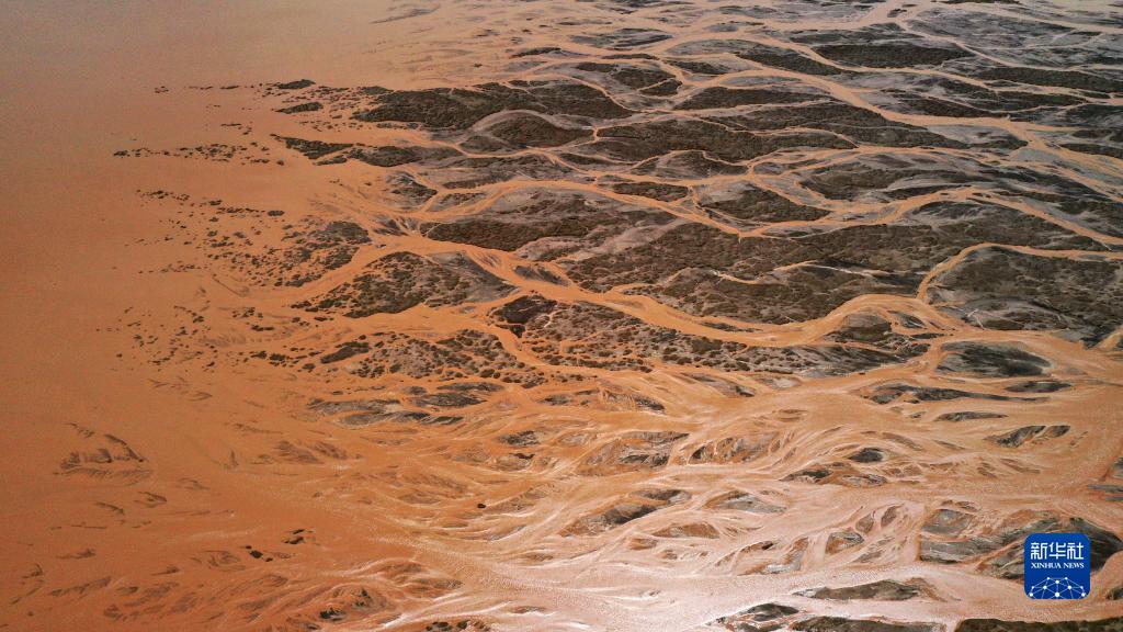 7月10日在新疆阿爾金山國家級自然保護區阿其克湖邊拍攝的洪水沖刷下的河谷(無人機照片)。