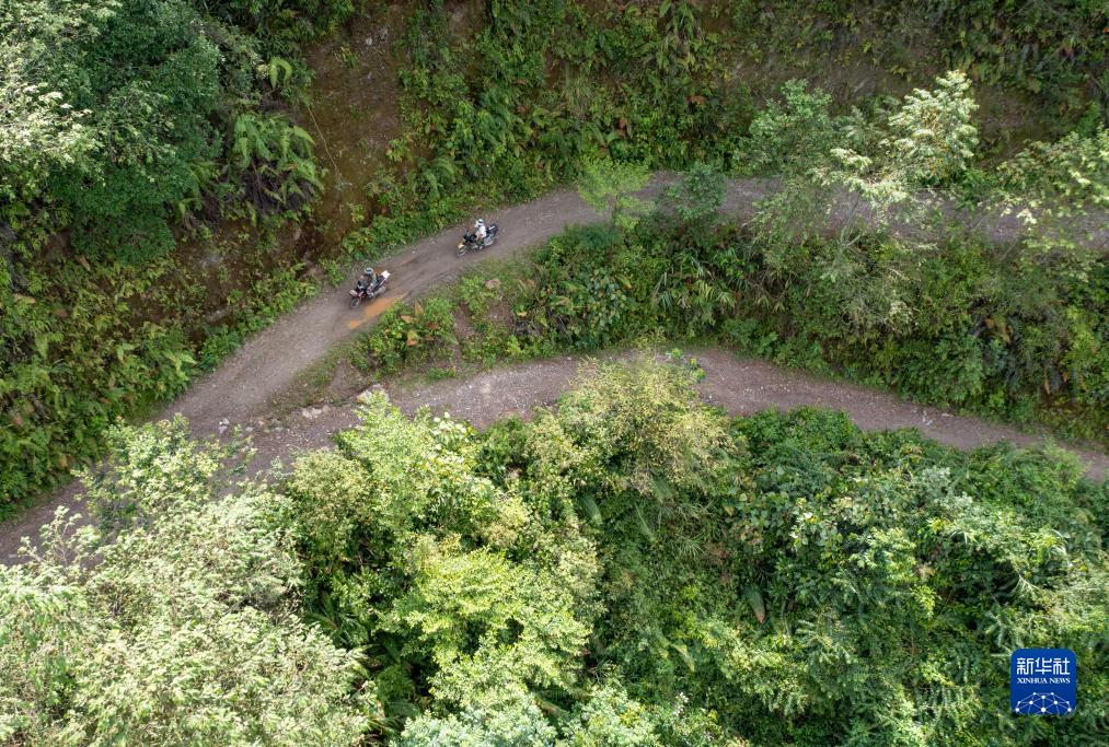 兩名監測隊隊員騎著摩托車去監測野象(7月20日攝,無人機照片)。