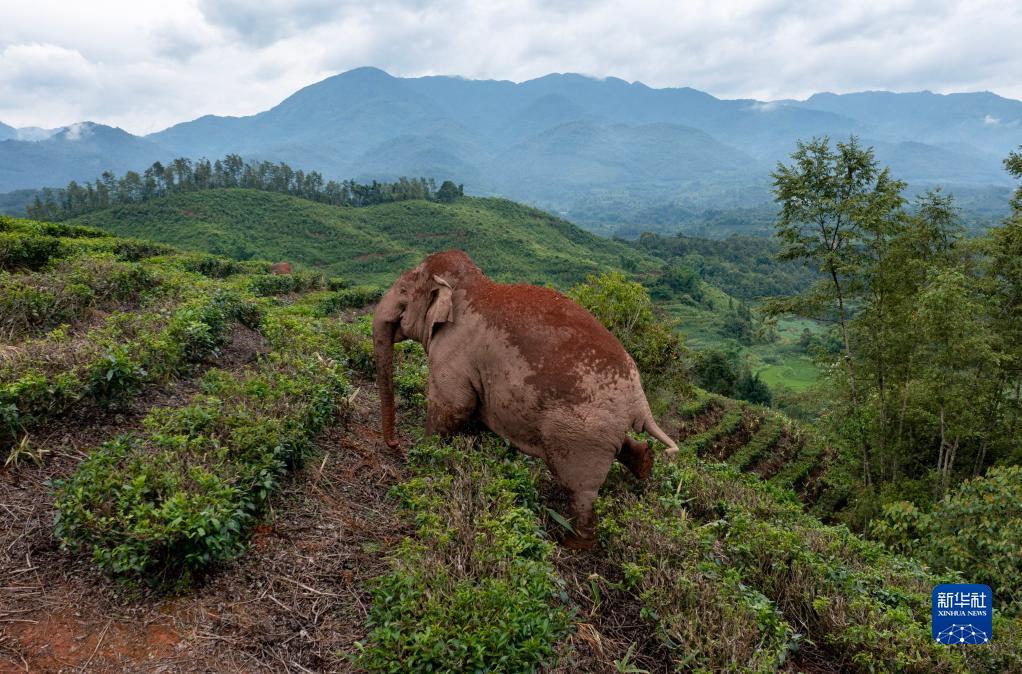 一頭亞洲象在云南省江城縣一處茶園里活動(7月19日攝,無人機照片)。