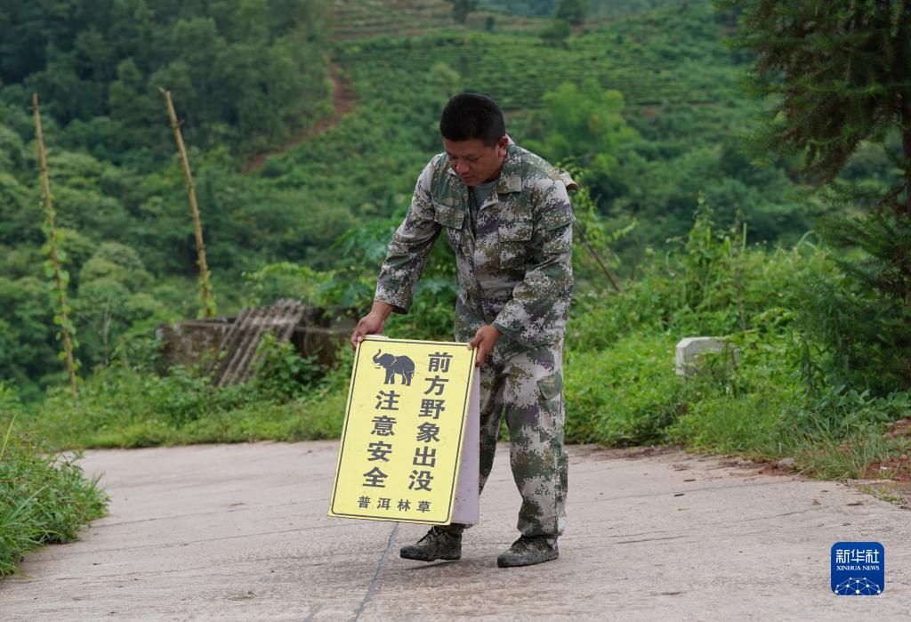 一名監測員在野象活動區域一處道路上設置警示牌(7月19日攝)。