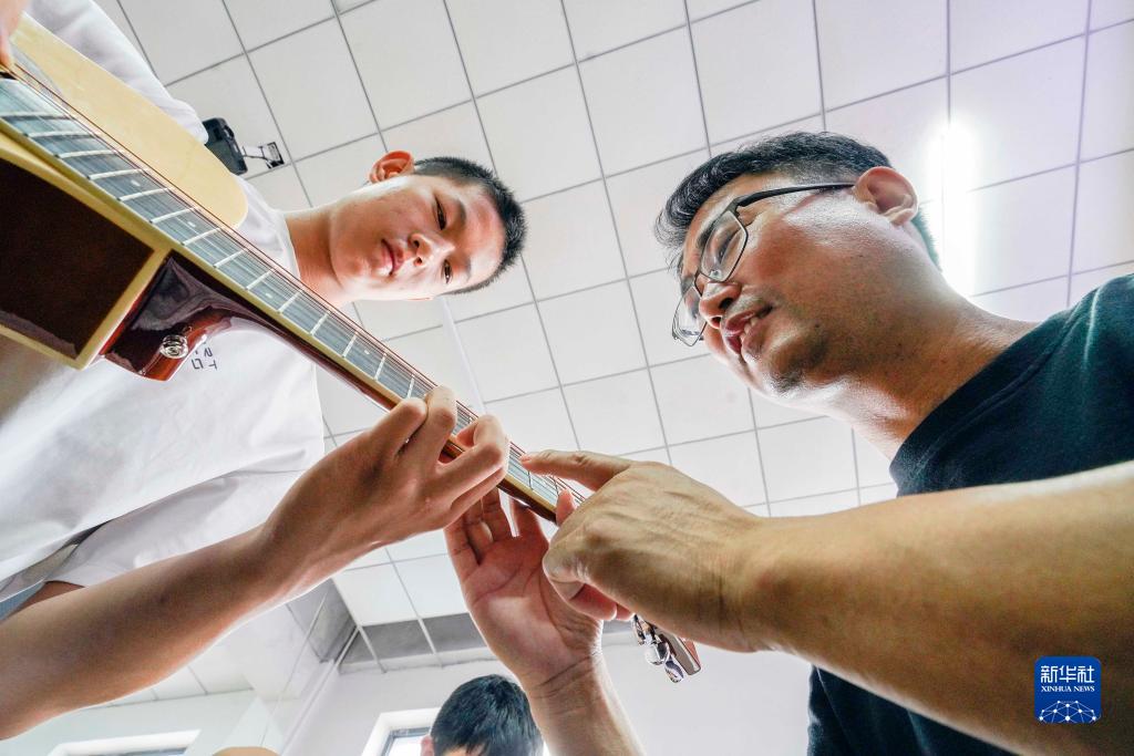 7月22日,在河北省遵化市文化館公益培訓班上,孩子跟隨老師學習吉他彈奏技法。