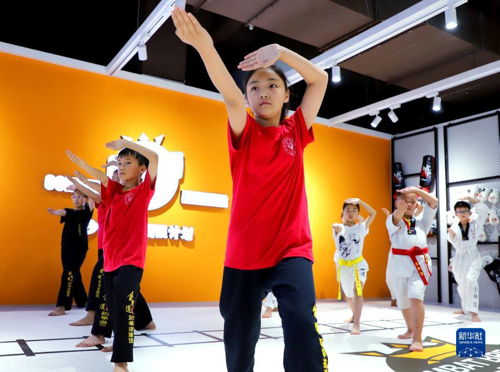 7月22日,在河南省南陽市區一家跆拳道館內,學生練習跆拳道。