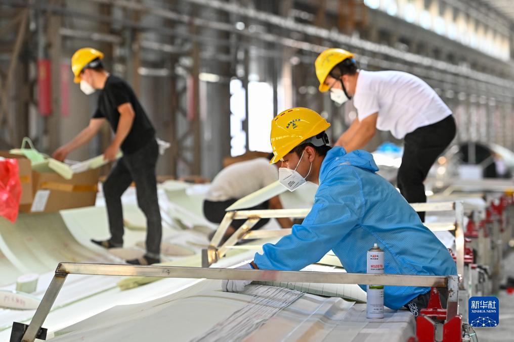 在新疆塔城重點開發開放試驗區先行發展區三一(塔城)風電設備有限公司,工人在葉片成型車間忙碌(7月22日攝)。