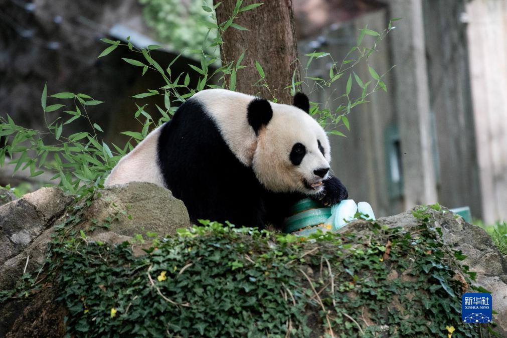 7月22日,在美國華盛頓史密森學會國家動物園,大熊貓“美香”享用生日蛋糕。
