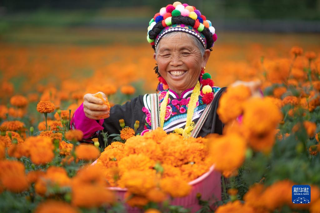 7月23日,云南省文山壯族苗族自治州馬關縣大栗樹鄉的一名婦女在采摘萬壽菊。