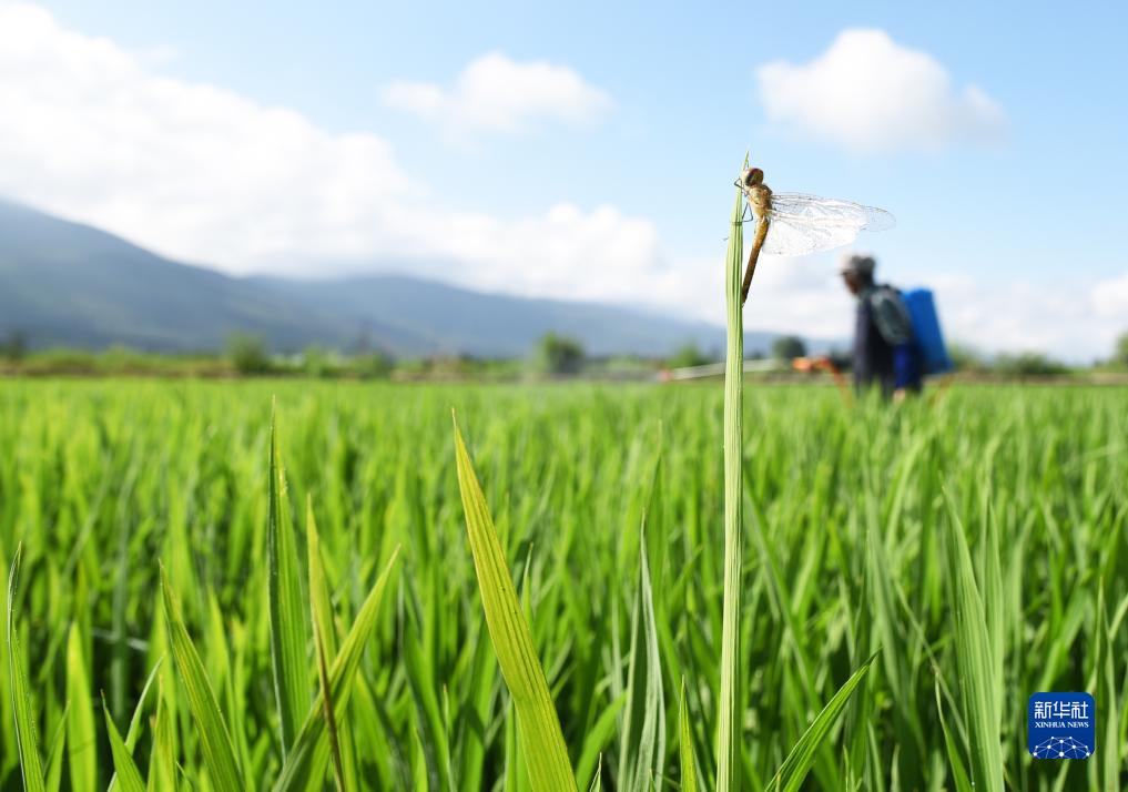 7月23日,在云南省麗江市古城區金山街道東元社區田間,村民在管護水稻。