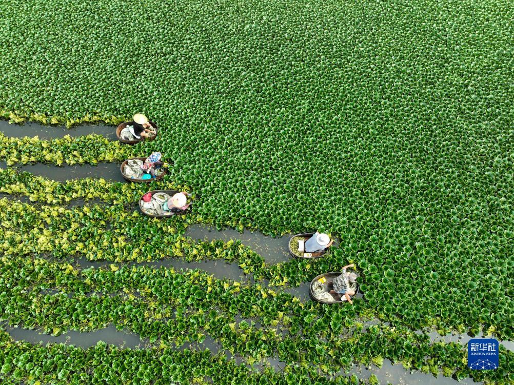 7月23日,江蘇省泰州市姜堰區婁莊鎮三聯村的農民劃著木桶在菱塘采摘菱角(無人機照片)。