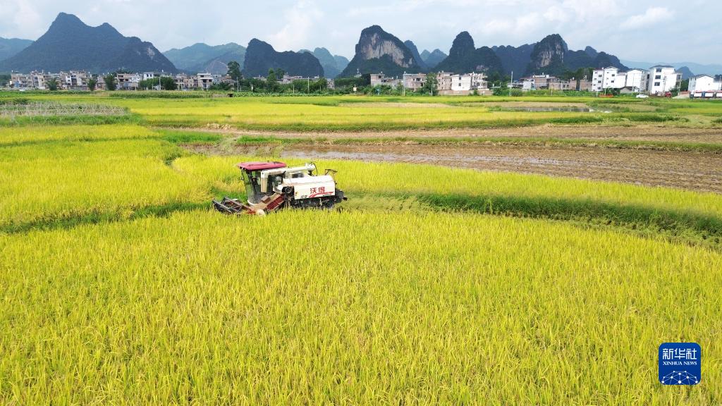 7月23日,在廣西賀州市平桂區鵝塘鎮鵝塘村,農機手駕駛收割機收割早稻(無人機照片)。