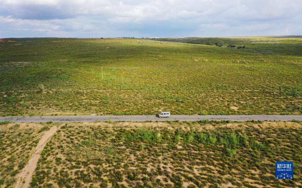 夏日時節,內蒙古自治區杭錦旗境內的穿沙公路綠意盎然,綠色沿著道路前行,并向兩旁的沙地鋪展,猶如一條條“綠色動脈”在庫布其沙漠中綿延。