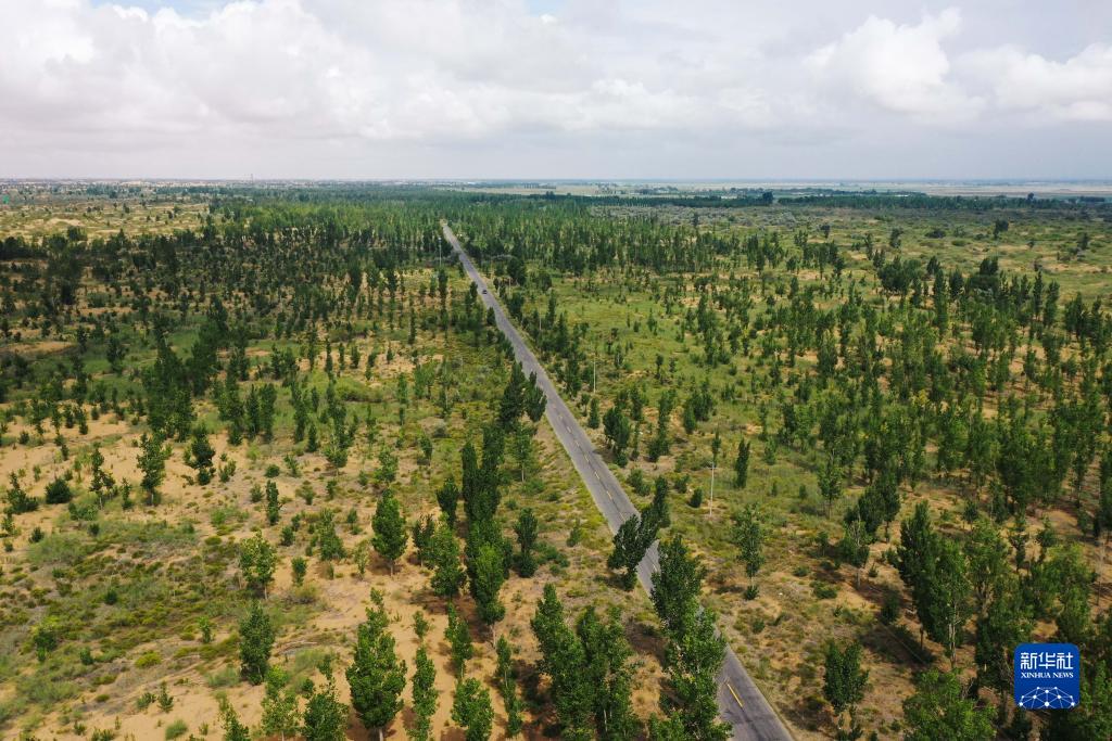 夏日時節,內蒙古自治區杭錦旗境內的穿沙公路綠意盎然,綠色沿著道路前行,并向兩旁的沙地鋪展,猶如一條條“綠色動脈”在庫布其沙漠中綿延。