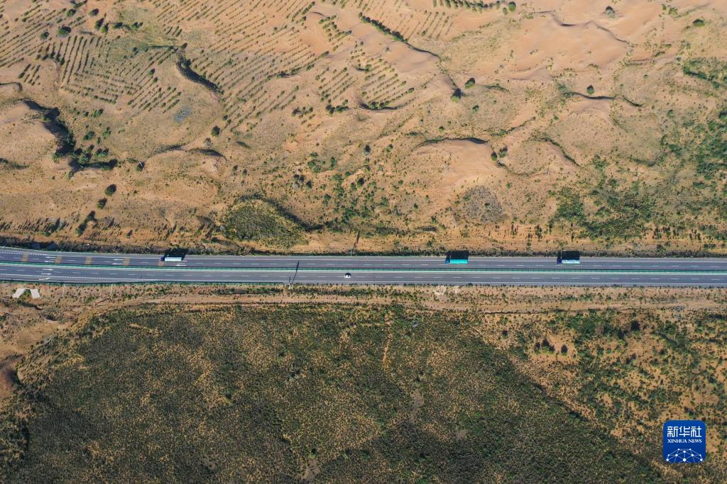 夏日時節,內蒙古自治區杭錦旗境內的穿沙公路綠意盎然,綠色沿著道路前行,并向兩旁的沙地鋪展,猶如一條條“綠色動脈”在庫布其沙漠中綿延。