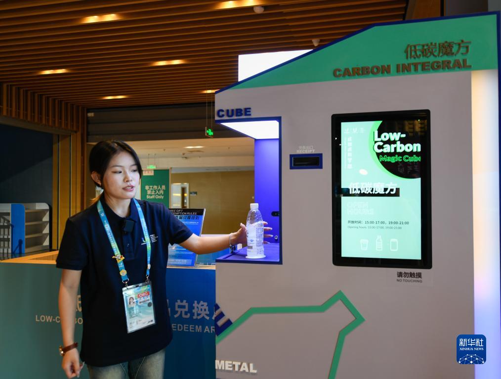 7月16日,在大運村藝術中心內,工作人員展示如何使用“低碳魔方”。將喝完的礦泉水瓶廢棄品投入“低碳魔方”可獲得“碳積分”小票,憑小票可兌換相應的大運會禮品。