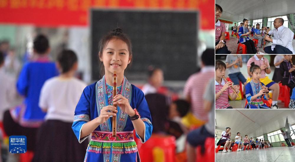 拼版照片:左圖為廣西三江侗族自治縣10歲的小學生石金晶;右圖為石金晶在縣文化館非遺公益培訓班上學習吹侗笛(照片均攝于7月13日)。暑假期間,三江侗族自治縣文化館舉辦侗笛公益培訓班,喜歡吹奏侗族樂器的石金晶報名參加。