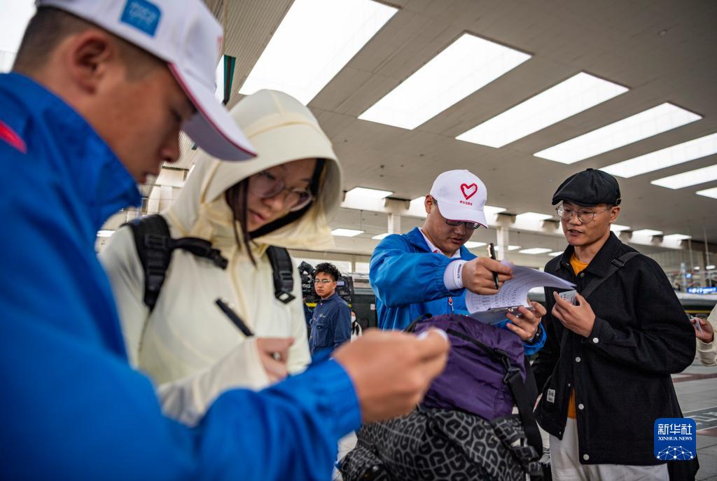 7月24日,在拉薩火車站,工作人員為抵達拉薩的志愿者登記信息。