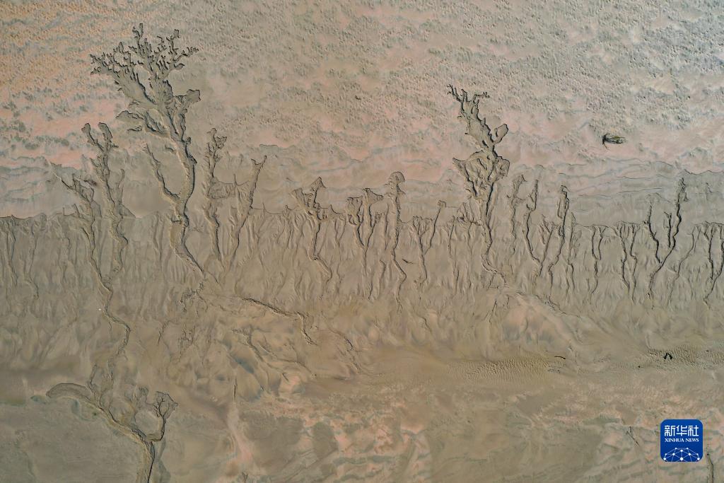 近日,隨著黃河調水調沙結束,黃河河南省開封市黑崗口險工段水位下降。河床被水流沖刷過后呈現出縱橫交錯的“脈絡”。