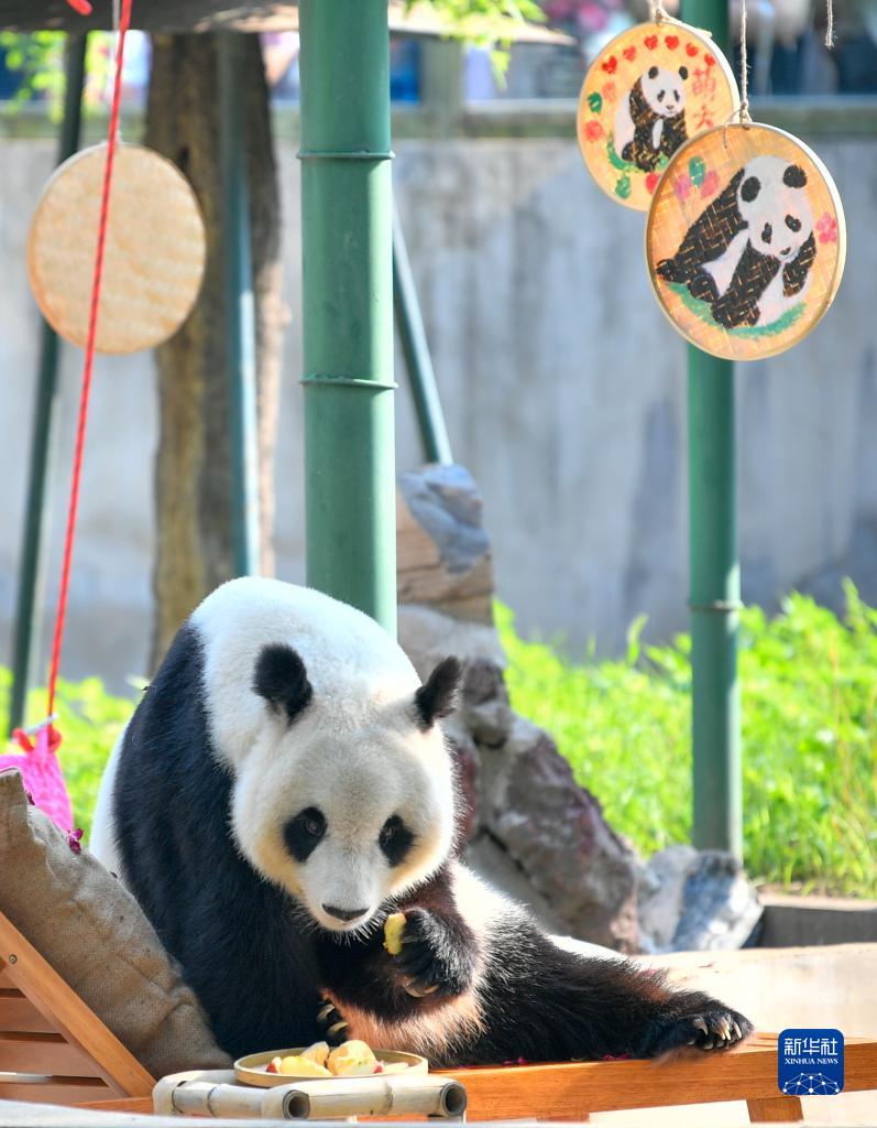 7月24日,在天津動物園熊貓館,大熊貓“喜樂”在躺椅上吃水果。