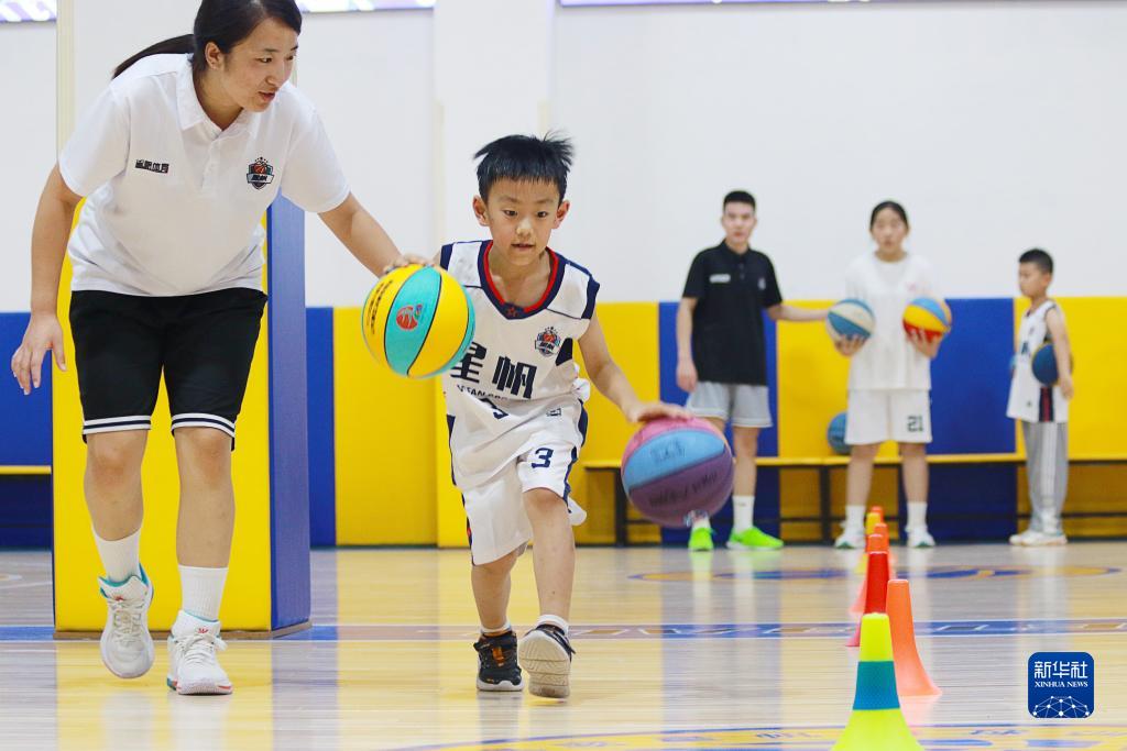 7月24日,在山東省高密市一籃球訓練營,孩子們在進行籃球基本功訓練。