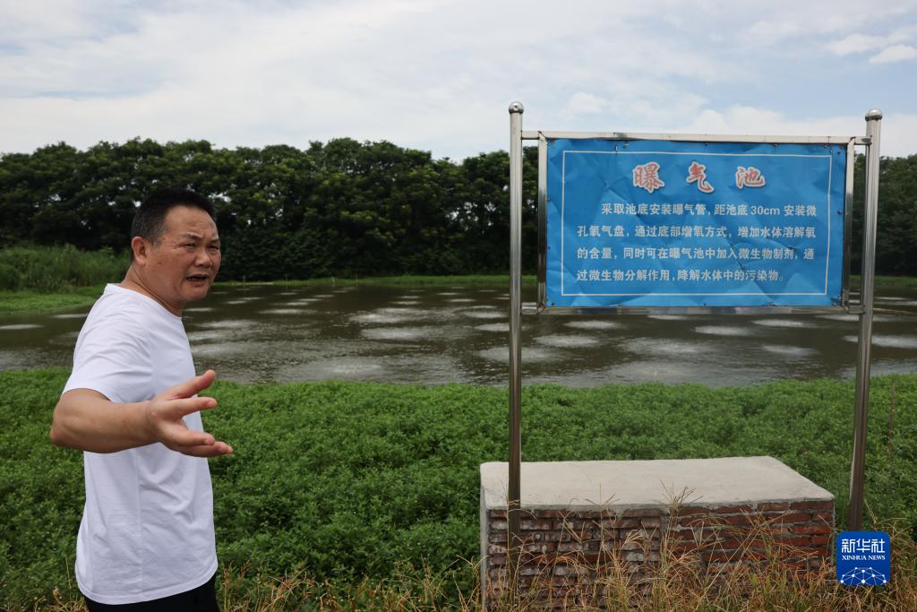 7月10日,謝永宏在湖南省益陽市大通湖區河壩鎮沙堡洲村一處牛蛙養殖基地,介紹由他們設計的“三池兩壩”養殖尾水處理設施。大通湖地處洞庭湖腹地,被稱作“洞庭之心”。新華社記者 金立旺 攝