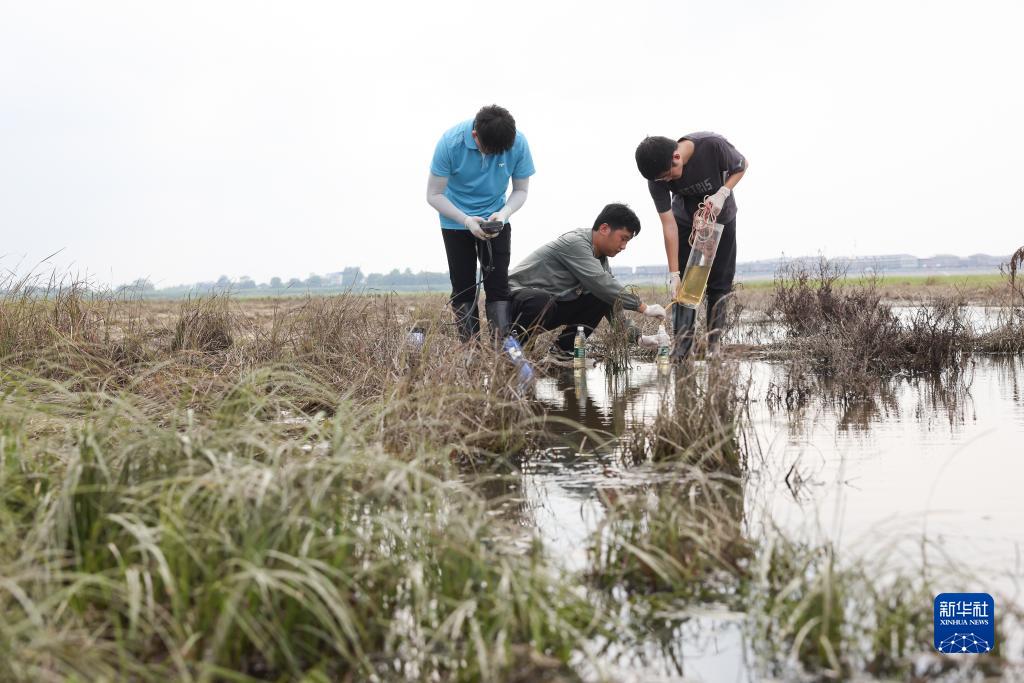 7月9日,中國科學院洞庭湖濕地生態系統觀測研究站科研人員在湖南東洞庭湖國家級自然保護區取水樣并測水質。新華社記者 金立旺 攝