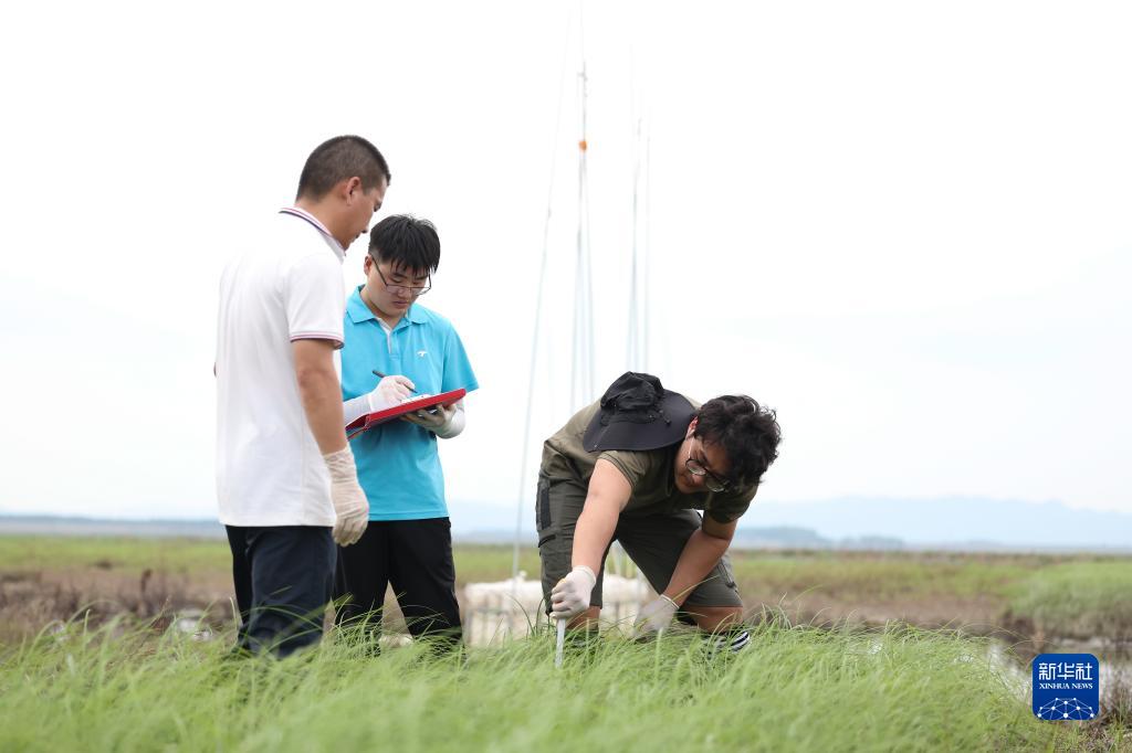 7月9日,中國科學院洞庭湖濕地生態系統觀測研究站科研人員鄒業愛博士(左)和學生在湖南東洞庭湖國家級自然保護區采集苔草樣本。新華社記者 薛宇舸 攝