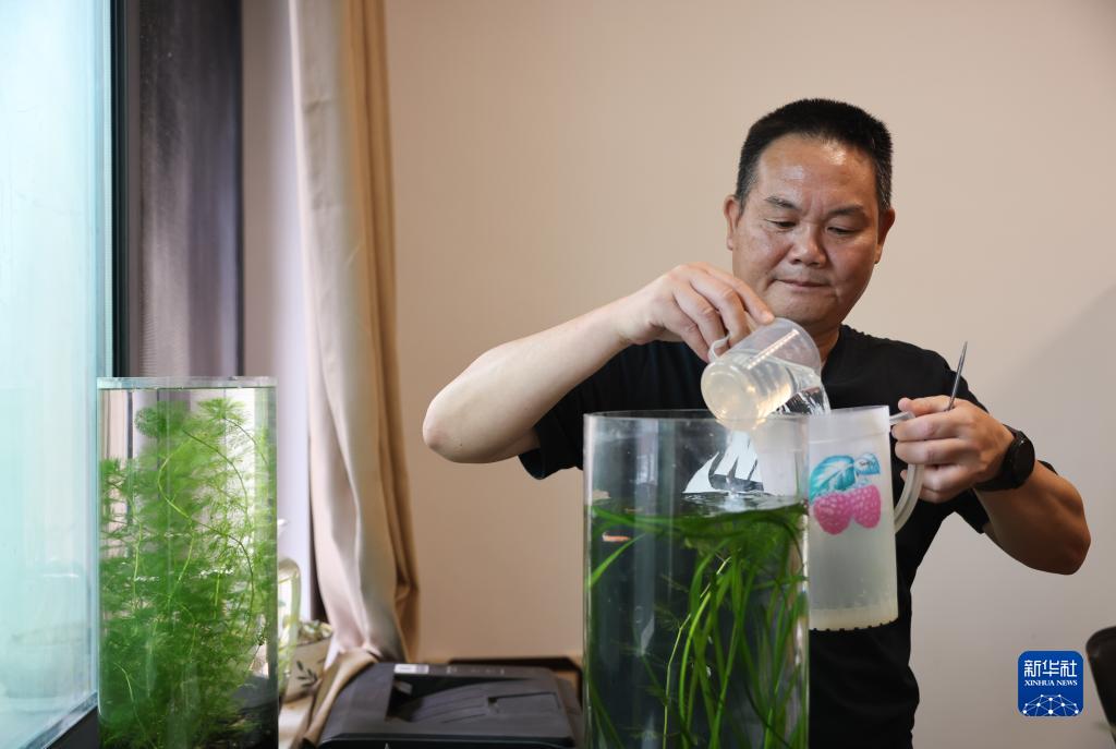 7月8日,謝永宏在位于湖南省長沙市的中國科學院亞熱帶農業生態研究所的辦公室內修剪種養的沉水植物。新華社記者 金立旺 攝