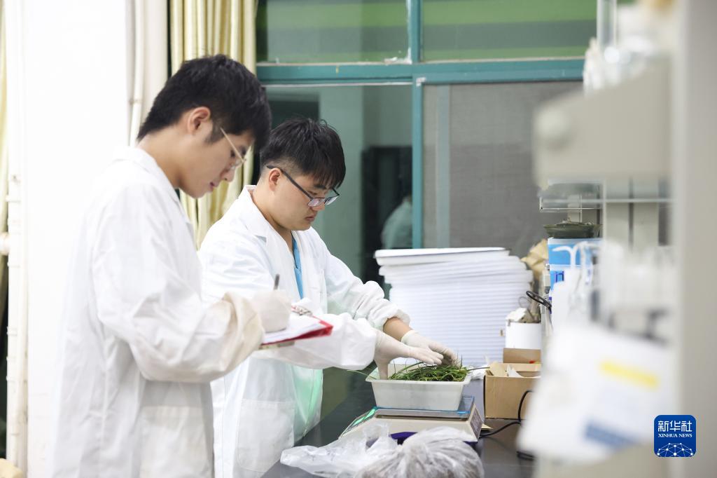 7月9日,科研人員在位于湖南省岳陽市的中國科學院洞庭湖濕地生態系統觀測研究站內將采集的苔草樣本稱重。新華社記者 薛宇舸 攝