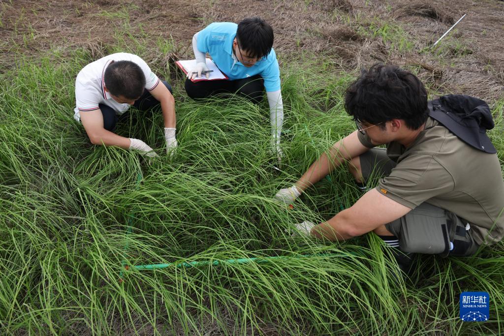 7月9日,中國科學院洞庭湖濕地生態系統觀測研究站科研人員鄒業愛博士(左)和學生在湖南東洞庭湖國家級自然保護區采集苔草樣本。新華社記者 金立旺 攝
