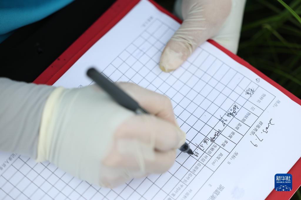 7月9日,中國科學院洞庭湖濕地生態系統觀測研究站科研人員在湖南東洞庭湖國家級自然保護區記錄采集苔草樣本的情況。新華社記者 薛宇舸 攝