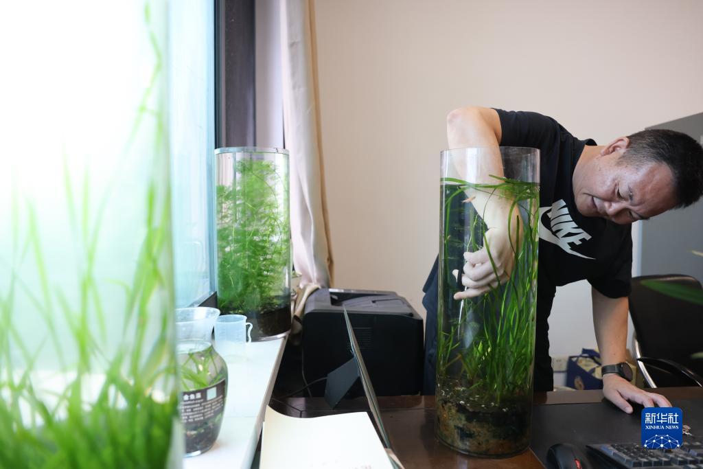 7月8日,謝永宏在位于湖南省長沙市的中國科學院亞熱帶農業生態研究所的辦公室內修剪種養的沉水植物。新華社記者 金立旺 攝