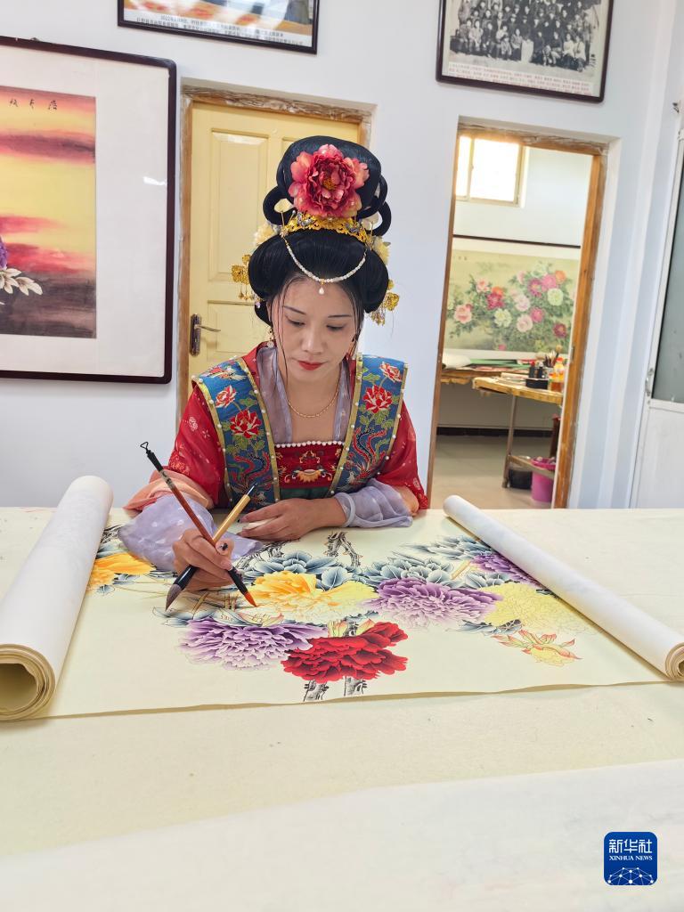 7月24日,畫師在山東省巨野縣永豐街道辦事處洪廟村鄉村畫院繪制工筆畫作品。