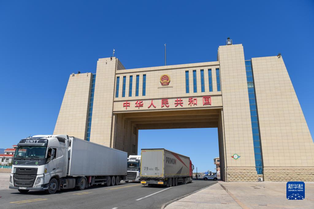 在新疆阿拉山口口岸,幾輛貨車在進出國門(7月24日攝)。