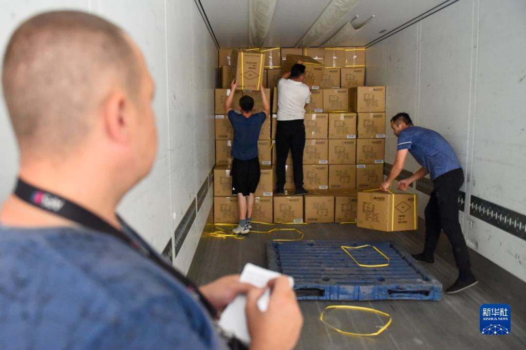 在新疆阿拉山口綜合保稅區內的跨境電子商務分揀清關中心,工作人員將貨物裝車(7月24日攝)。