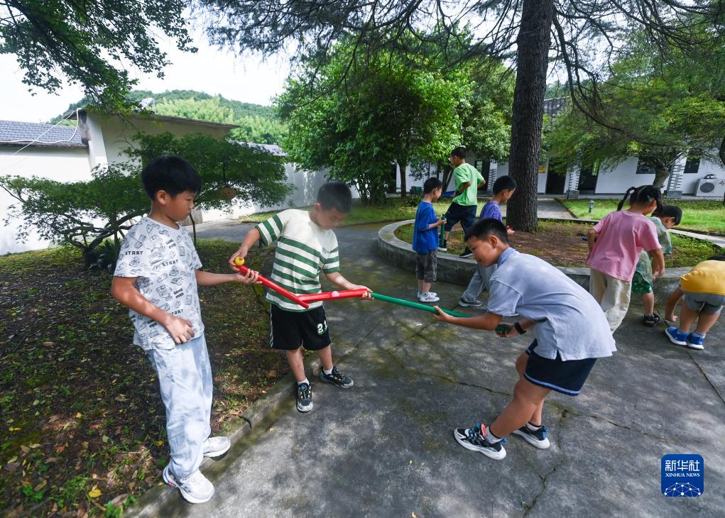 7月25日,在諸暨市馬劍鎮上和村的侯門山鄉村圖書館,暑托班的孩子們在玩游戲。